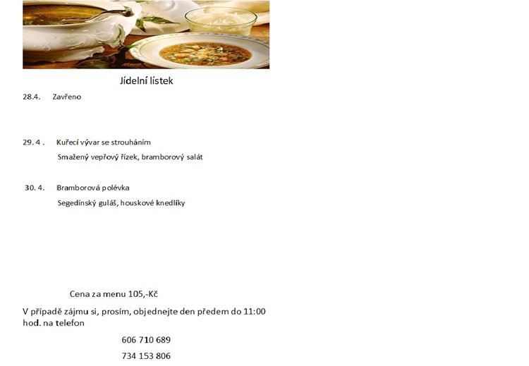 Menu na 29. - 30. 4. 2026 - Dne 28. 4. 2026  restaurace zavřena !!!